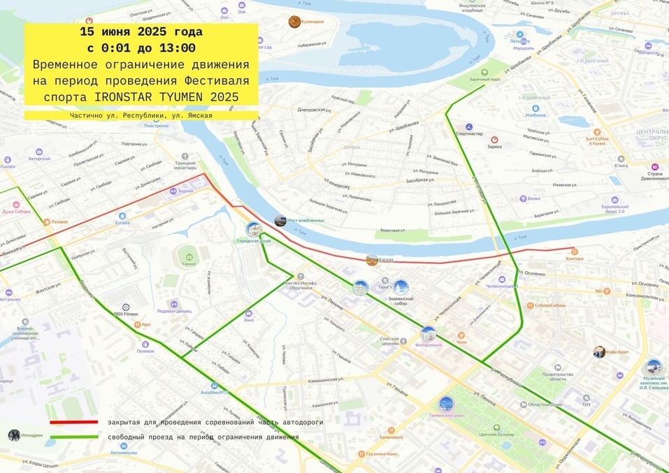 В Тюмени 14 и 15 июня вновь пройдут любительские соревнования по триатлону IronStar. Стартовый городок фестиваля расположится рядом с «Конторой пароходства». Плавательный сегмент триатлона проведут на открытой воде в Туре, маршруты забегов проложены на набережной, а велогонка пройдет по улицам Тюмени. Как сообщили организаторы соревнований, в день проведения фестиваля 15 июня 2025 г. с 00:01 до 13:00 местного времени будет временно ограничено движение транспорта по следующим улицам: ул. Республики — от ул. Ленина (Музей Городская Дума) до ул. Коммунистическая (Ямская); ул. Коммунистическая — от ул. Республики до ул. Ямская; ул. Ямская — от ул. Коммунистическая до ул. Аккумуляторная (полное ограничение); ул. Ямская — в направлении к центру от аэропорта Рощино до ул. Аккумуляторная (в обратном направлении проезд будет открыт). Также во всех зонах ограничения на весь период действия перекрытий будет запрещена стоянка автотранспорта. Фото IRONSTAR TYUMEN 2025 Вконтакте. Фото IRONSTAR TYU