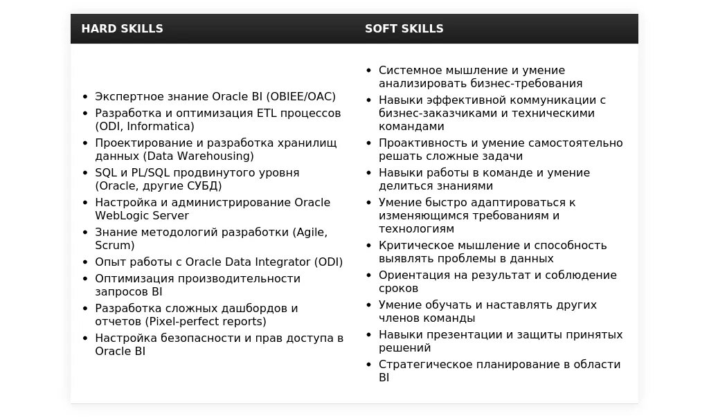 - Разделите навыки на категории: Разделите свои навыки на категории (например, "Инструменты Oracle BI", "Языки программирования", "Базы данных", "Методологии разработки").