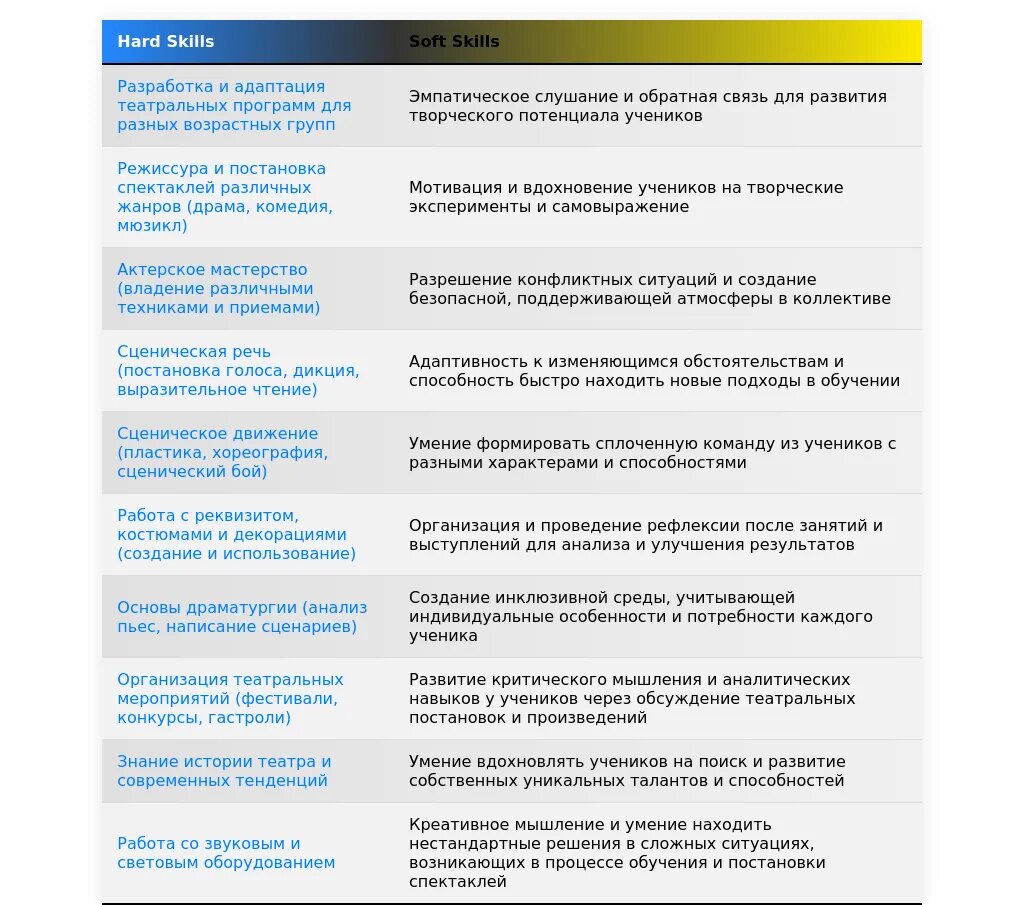 До: "Актерское мастерство, сценическая речь, вокал, хореография, коммуникабельность, ответственность." После: Профессиональные навыки: Актерское мастерство (с детьми 7-10 лет), сценическая речь, постановка детских спектаклей. Личные качества: Коммуникабельность, умение находить подход к детям, креативность.