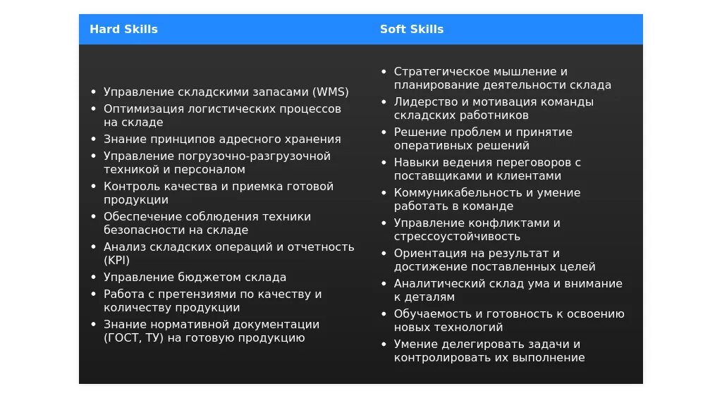 - Сгруппируйте навыки по категориям: Например, "Управление складом", "Логистика", "Работа с WMS".