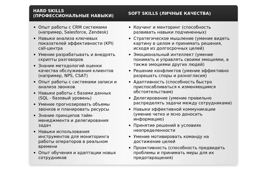 - Управление командой: "Руководил командой из N операторов", "Организовывал работу call-центра", "Обучал и мотивировал персонал", "Оценивал эффективность работы операторов".