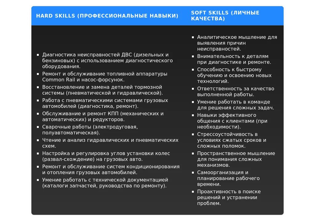- На какие качества и навыки делать акцент:Знание устройства грузовых автомобилей и их основных систем.