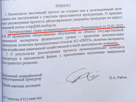 Сначала природоохранная прокуратура выражает протест на слушания полигона ПНТЗ, с заключением что они прошли с нарушениями. Затем по нашему иску, который рассматривал судья Теплоухов Павел Вениаминович, суд признает проведенные слушания незаконными.