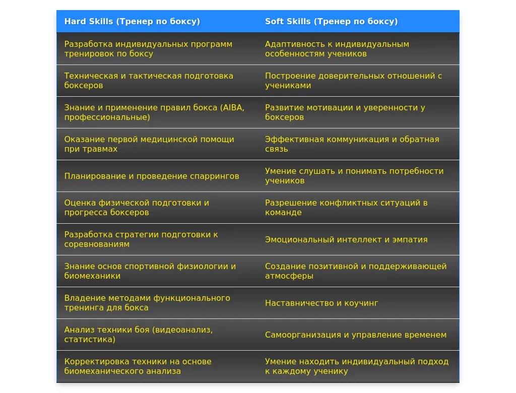 - Тренер по боксу для профессиональных спортсменов: "Опыт подготовки спортсменов к соревнованиям", "Знание спортивной физиологии и психологии", "Разработка индивидуальных программ тренировок", "Анализ техники и тактики боя".