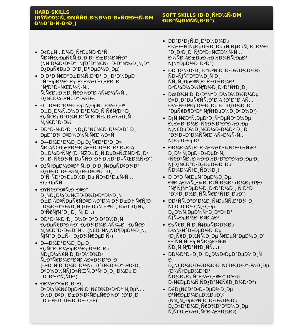 Разделите навыки на категории (например, "Технические навыки", "Коммуникативные навыки", "Личные качества") и расположите их в порядке убывания значимости для конкретной вакансии.