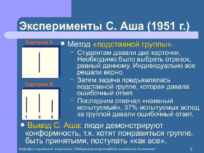 КОНФОРМИЗМ И ЕГО ПРОЯВЛЕНИЯ НА ВБ В 1951 г. Соломон Аш провел эксперимент условия которого указаны на картинке. Конформизм простыми словами — это принятие существующего порядка вещей без критического анализа и выработки собственной позиции, под влиянием окружающих. Конформность существенно возрастала, когда рядом с испытуемым добавляли трех сообщников экспериментатора, однако при дальнейшем увеличении их числа, до 10-15, не росла. Добавление человека, который не соглашается с мнением группы - который дает верный ответ или даже неверный, но отличающийся от выбора группы - резко снижает уровень конформизма, примерно на 5-10%. Как итог: 37% - следовали за большинством не разбираясь верен был ответ или нет. Им не хочется разбираться в причинах другой точки зрения, они заведомо считают ее неверной, потому что за ними — вся сила большинства. 3 человека в группе с одинаковым мнением достаточно для того, чтобы в 37% случаях четвертый участник принял их точку зрения не разбираясь. КАК