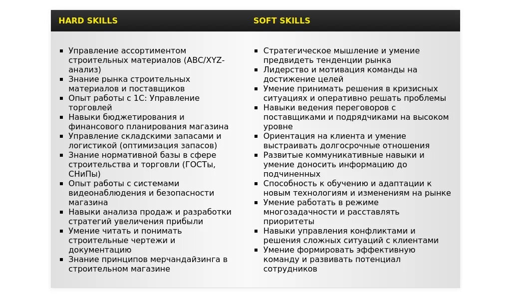 - Обязательная информация:Ключевые навыки и компетенции, релевантные должности директора магазина строительных материалов (управление персоналом, знание строительных материалов, навыки продаж и т.д.).