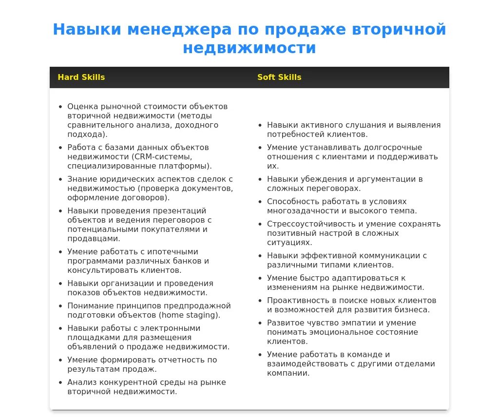 - Какую информацию обязательно включить:Ключевые навыки и компетенции, релевантные для позиции менеджера по продаже вторичной недвижимости (например, ведение переговоров, знание рынка недвижимости, навыки продаж).