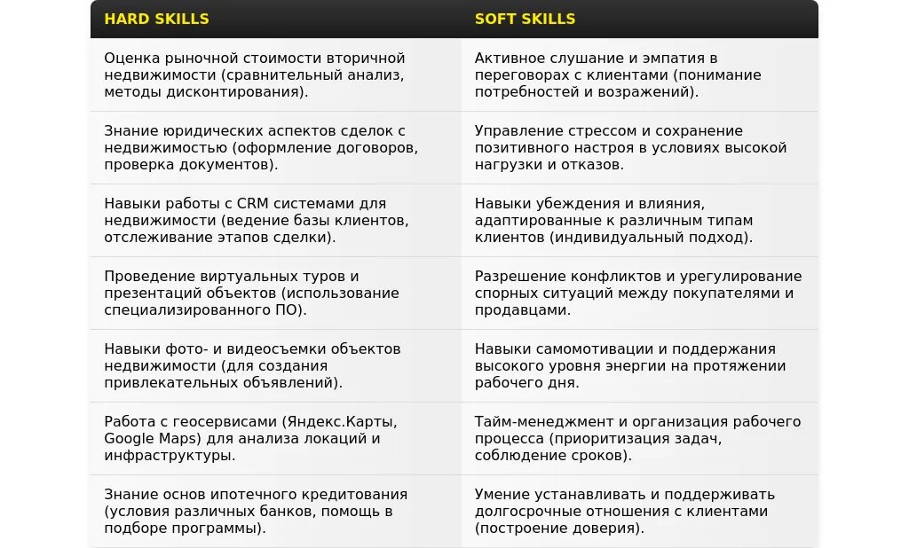 "Навыки продаж: Ведение переговоров (эксперт), заключение сделок (продвинутый), работа с возражениями (продвинутый). Навыки работы с клиентами: Консультирование клиентов (эксперт), установление контакта с клиентами (эксперт), работа с VIP-клиентами (средний). Профессиональные навыки: Знание рынка вторичной недвижимости (эксперт), работа с CRM-системами (продвинутый), оформление сделок (продвинутый)."