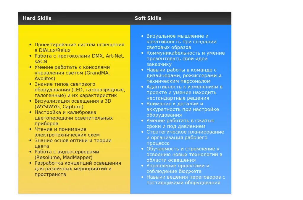 Пример 2: Адаптация раздела "Навыки" для вакансии художника по свету на концертной площадке