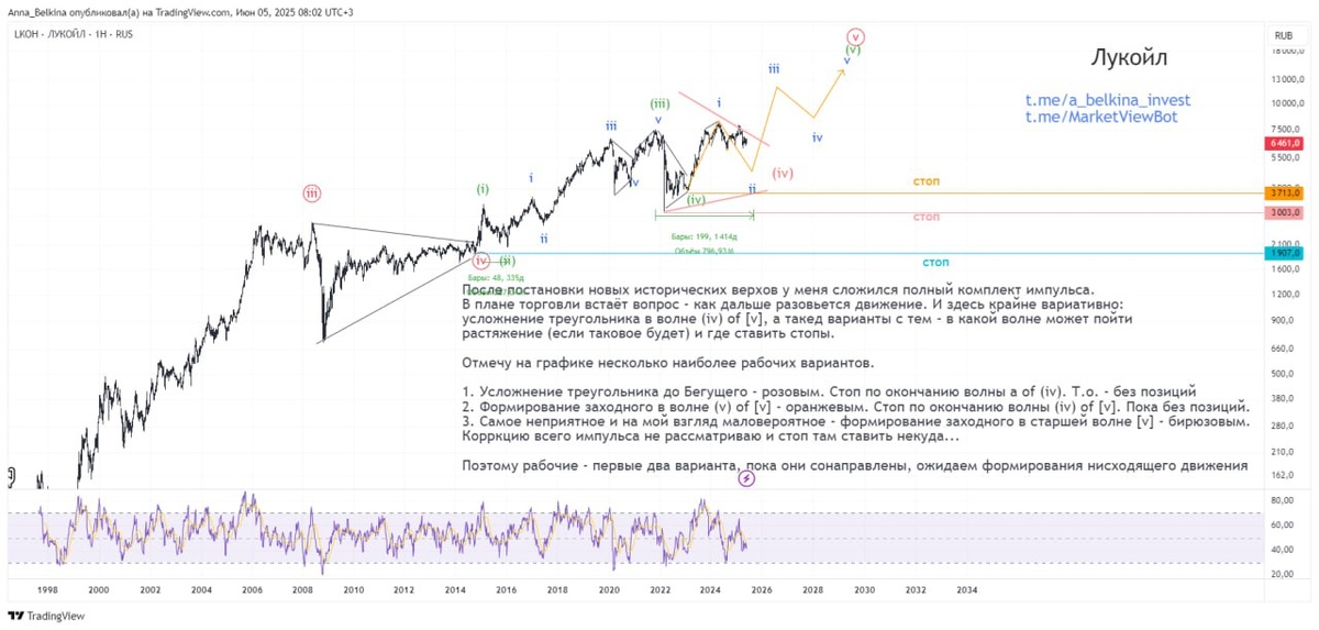 Разметки из видео о голубых фишках росс рынка https://dzen.ru/media/id/65b8789ff12bfe0796a26941/it-video-68408f51b237623e4f26c157 #нефтяники #ГолубыеФишки Лукойл #LKOH По Лукойлу продолжают отрабатываться два основных сценария – либо это заходной с формирующейся волной ii of (v) of [v], в которой падение еще не завершено. Либо это всё еще развивающаяся волна (iv) в виде треугольника, в которой идет нисходящая волна с of (iv). В моменте оба сценария сонаправлены на продолжение падения. В целом, пока #нефтяники чувствуют себя слабо – здесь и повышенные налоги с начала года, санкции на теневой флот, укрепление рубля #USDRUB #Si на фоне падающей нефти #Brent. Подробнее о движении на младших степенях в видео. Не является ИИР 💪 Бот Закрытого Канала и Еженедельных звонков