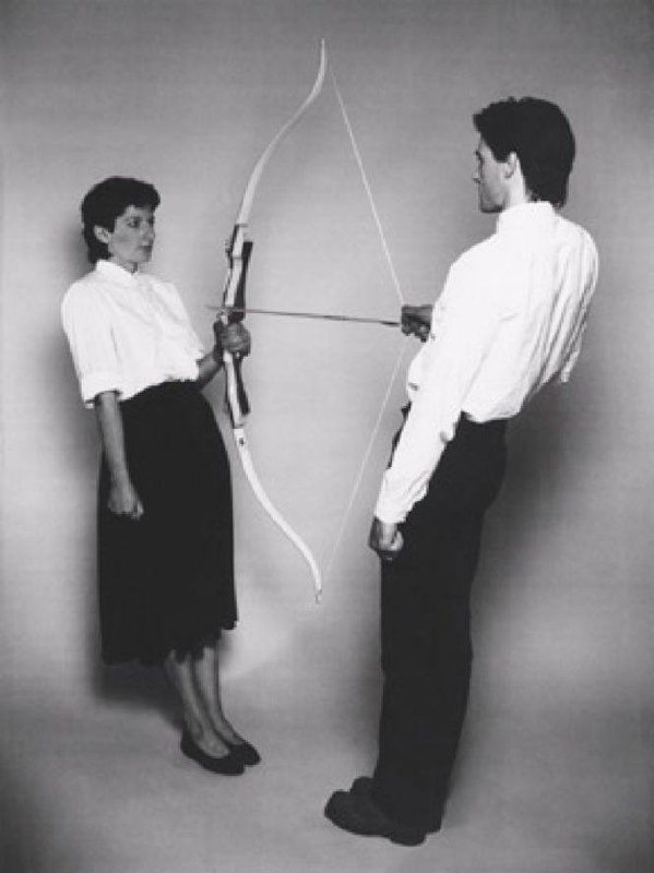 В 1980 году Марина Абрамович и её партнер Улай в Национальной галерее Ирландии провели совместный перформанс «Энергия покоя» Марина держала лук для стрельбы, а Улай — его натянутую тетиву и стрелу. Стрела была направлена на грудь Марины и если бы Улай случайно отпустил тетиву — скорее всего, «бабушки перформанса» с нами не было бы. 📍Перформанс длился четыре минуты двадцать секунд, но по воспоминаниям Абрамович это было вечностью. Напряжение было невыносимым! С каждой секундой сердца бились всё быстрее и быстрее, а публика отчетливо слышала бешеный ритм влюбленных сердец, так как и у Марины, и у Улая под рубашкой к груди были прикреплены маленькие микрофоны. Что вы подумали про этих двоих, читая строки выше? Какая цель была у художников? 📍По словам Абрамович, эта работа была предельным выражением доверия. Доверия в паре! Всем бы нам такого доверия;) 📍В то время влюбленные художники интересовались гипнозом, пытаясь пробраться к бессознательному. Они сделали несколько перформанс