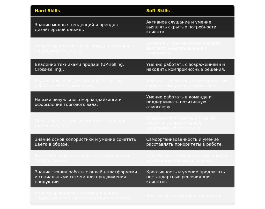 - Для вакансий в премиум-сегменте: "Работа с VIP-клиентами", "Индивидуальный подход", "Создание стильных образов", "Знание модных трендов".