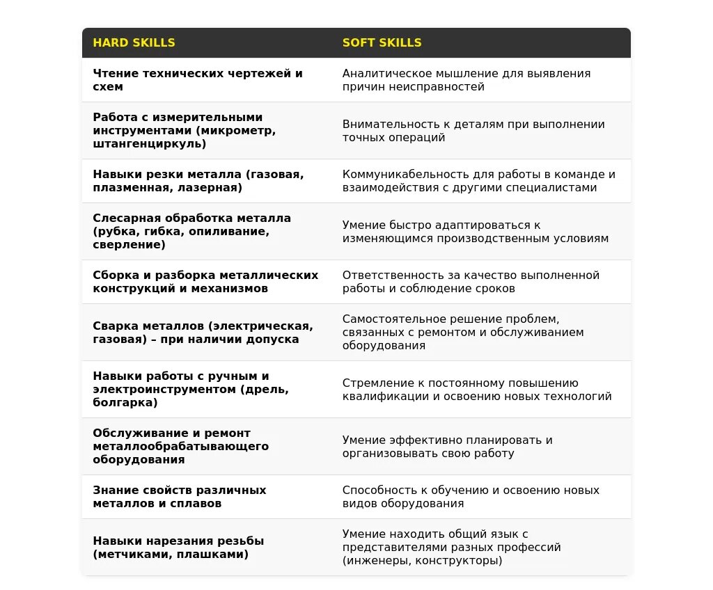 Ключевые навыки, релевантные для позиции слесаря по металлу.