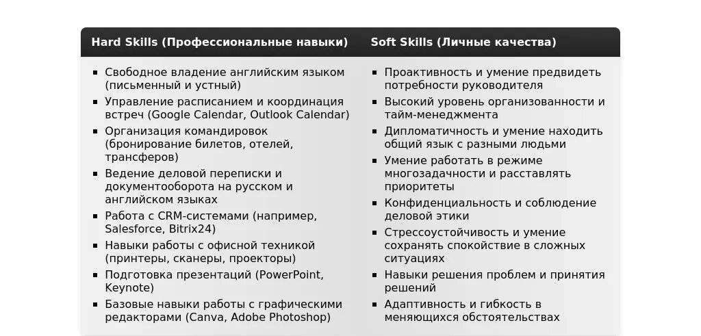 - Для вакансий в IT-компаниях: "Опыт работы с Google Workspace", "Навыки работы в Jira/Confluence", "Понимание специфики IT-индустрии".
