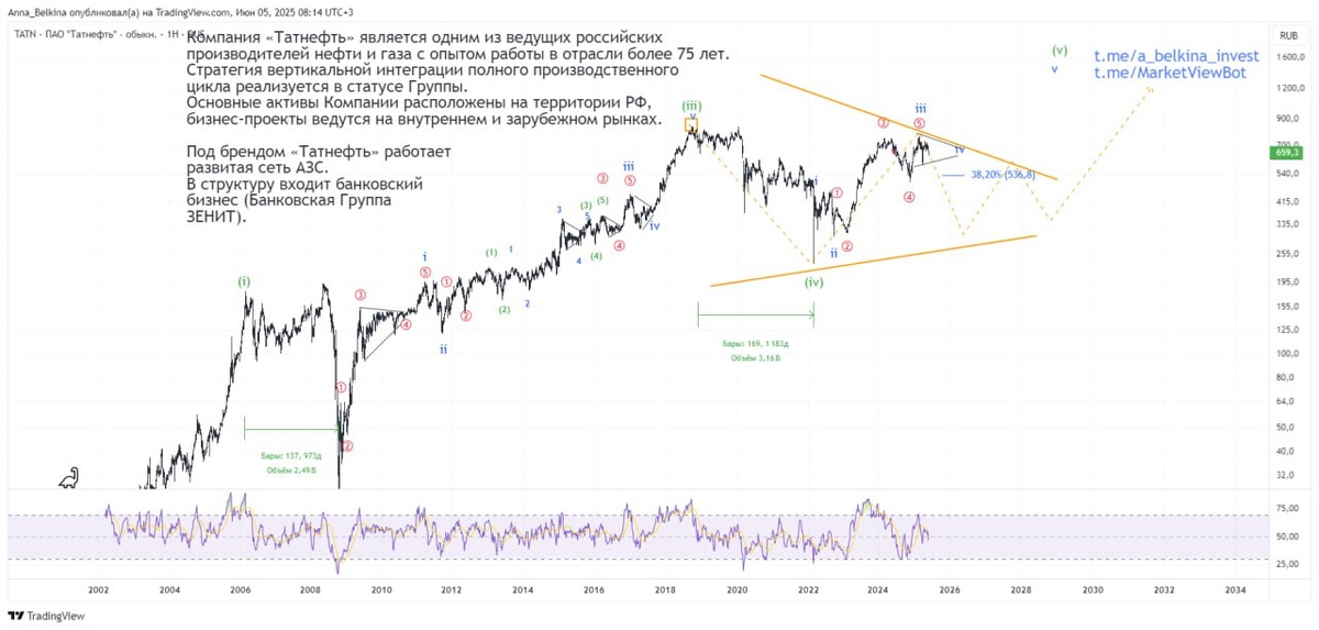 Разметки из видео о голубых фишках росс рынка https://dzen.ru/media/id/65b8789ff12bfe0796a26941/video-68408f51b237623e4f26c157 #ГолубыеФишки Татнефть #TATN Одна из самых сильных среди #нефтяники. Здесь не сломан вариант движения импульсом с низов 2022. Локально, формируется коррекционная волна iv of (v), после завершения которой ожидаю роста в пятой волне импульса v. Тем не менее, сохраняется вероятность развития альтернативного варианта движения через масштабный треугольник – в оранжевых образующих. Подробнее о движении на младших степенях в видео. Не является ИИР 💪 Бот Закрытого Канала и Еженедельных звонков
