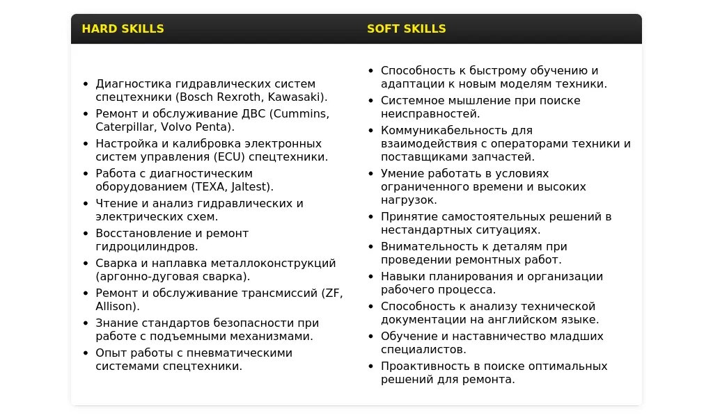 "Технические навыки: диагностика и ремонт дорожно-строительной техники (экскаваторы, бульдозеры, катки), ремонт гидравлических систем, чтение технической документации. Навыки работы с оборудованием: сварочное оборудование, диагностическое оборудование, слесарный инструмент. Личные качества: ответственность, внимательность, умение работать в команде."