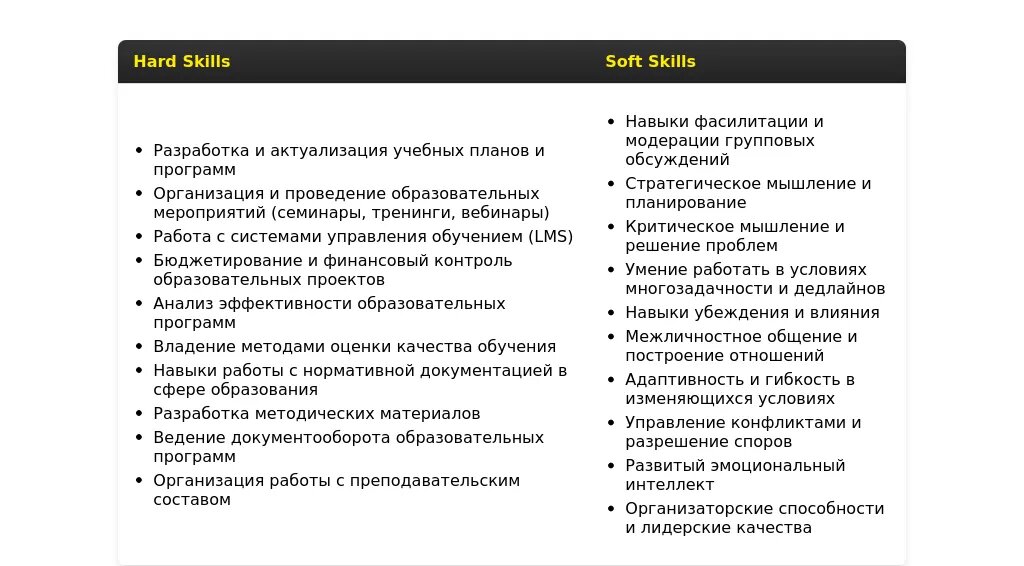 - Для корпоративного обучения: "Организация корпоративных тренингов", "Работа с тренерами и спикерами", "Оценка эффективности обучения", "Работа с бюджетом", "Ведение переговоров с поставщиками образовательных услуг".