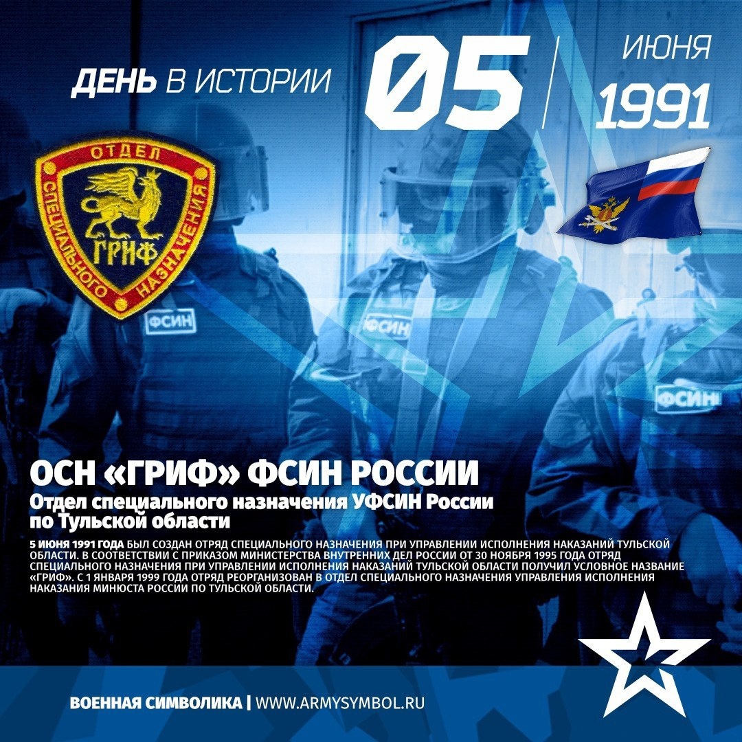 ОСН «Гриф» ФСИН России с 1991 Отдел специального назначения УФСИН России по Тульской области 5 июня 1991 года был создан Отряд специального назначения при Управлении исполнения наказаний Тульской области. В соответствии с приказом Министерства Внутренних Дел России от 30 ноября 1995 года отряд специального назначения при Управлении исполнения наказаний Тульской области получил условное название «ГРИФ». С 1 января 1999 года отряд реорганизован в отдел специального назначения Управления Исполнения Наказания Минюста России по Тульской области. За время существования Отдела Специального Назначения личный состав подразделения принимал активное участие во многих боевых спецоперациях. Сотрудники ОСН «ГРИФ» неоднократно находились в служебных командировках в Чеченской Республике. Там они выполняли такие служебные задачи как: штурм города Грозный, охрана маршрутов движения и сопровождение кол Показать полностью... Подпишитесь на наши группы ВКонтакте и в Одноклассниках - читайте, смотрите и