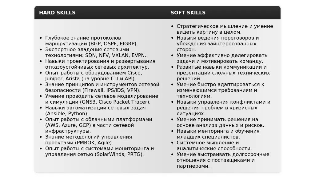 - Разделите навыки на категории (например, "Сетевые технологии", "Безопасность", "Автоматизация").