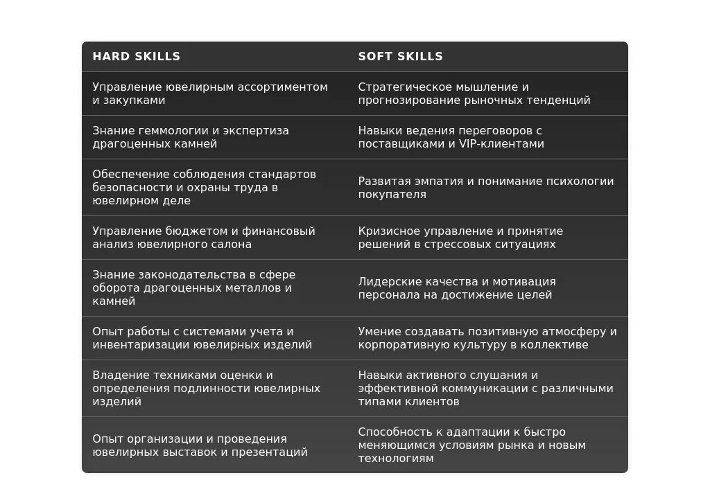 - Личные качества и навыки: Подчеркните качества, важные для директора ювелирного салона: лидерские качества, коммуникабельность, организаторские способности, ответственность, знание ювелирного дела.