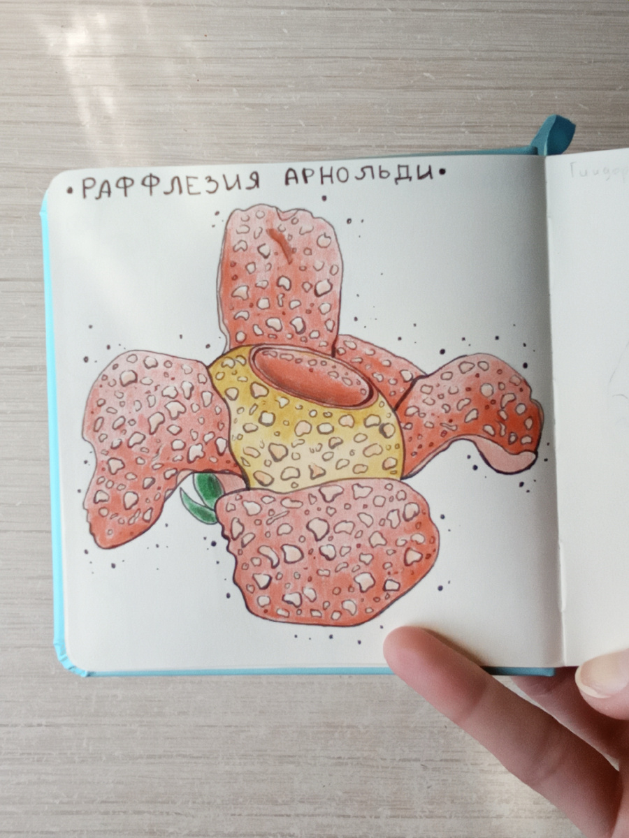 Всем чернично-космический привет! У меня сегодня день ботаники. Пока рисую кое-что новенькое, связанное с кинематографом, решила просмотреть архив. Что-то снимала заранее и уже забыла. Так вот, завалялся пост с рисунком необычного цветка Раффлезии Арнольда. Помните, я раскрашивала её на марафон от Леопарды? Тогда я ещё и зарисовала растение в скетчбуке. Вдохновением для меня послужили фотографии. Порывшись в обилии разных фото, я нашла подходящий референс с удачным светом и ракурсом растения. Для работы взяла линеры разной толщины и цветные карандаши от Berlingo SUPER SOFT Pro. Первое, что я сделала, - набросала Раффлезию на клочке бумаги, чтобы потренироваться. Ведь она весьма необычной формы: одновременно массивная и изящная. После тонким линером начала прорисовывать контур, особое внимание уделяя узорам на лепестках. Далее поработала линером с толстым наконечником. Ведь тонкие линии подчеркивают детали, а более толстые создают ощущение объема. Важно не переусердствовать, что