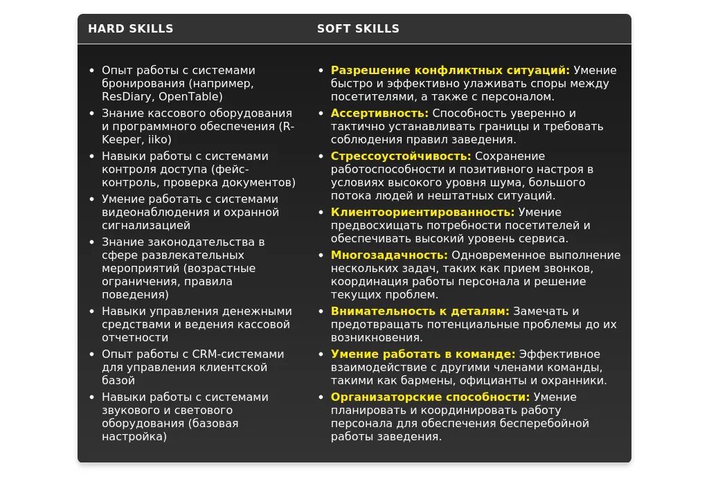 - Для вакансий, требующих организаторских способностей: "Опыт организации мероприятий", "Навыки управления персоналом", "Планирование и координация работы", "Обеспечение бесперебойной работы заведения".