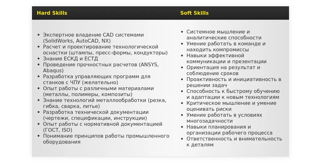 Подчеркните владение CAD-системами, знание основ материаловедения, технологических процессов, а также аналитические способности и умение работать с технической документацией.