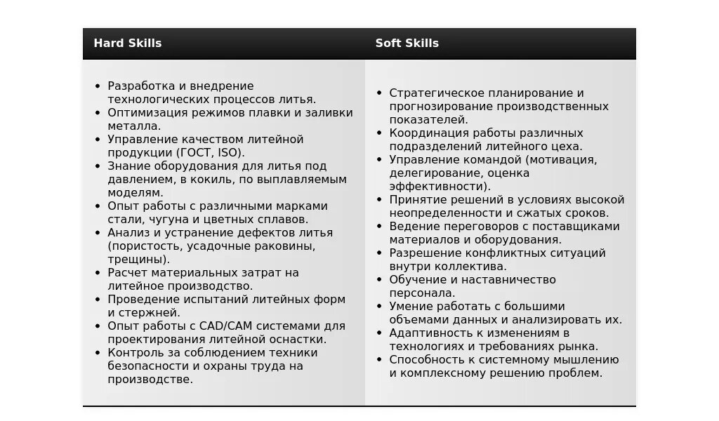 Ключевые навыки и компетенции, релевантные для должности начальника литейного производства.