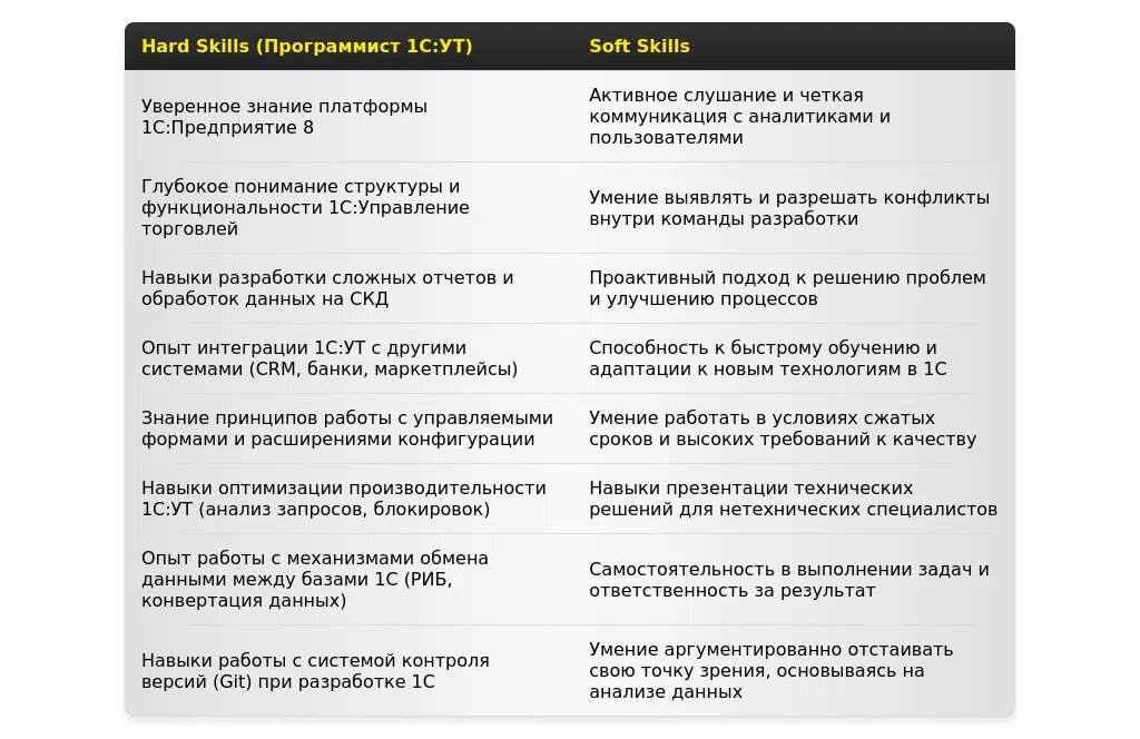 В заголовке резюме следует явно указать, что вы программист 1С, специализирующийся на конфигурации "Управление торговлей" (УТ). Это позволит рекрутерам сразу понять вашу экспертизу и релевантность вакансии.