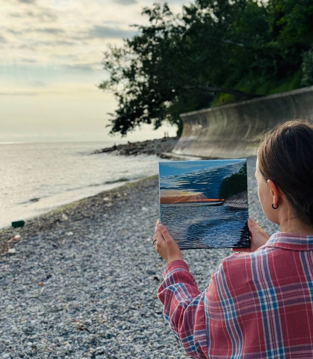 Сегодня наконец-то возвращаемся Домой 😊 Жуть, как соскучился по нашему краю ♥️ Было у нас с Катей любимое место, отдаленное от общественного пляжа, где и народу поменьше и пейзажи получше 😉 Вчера по пути на то место, встретили местного художника🧑🎨 продающего свои работы. И надо же - ровно проход в то место был изображен на картине 🤩 ну кончено, эта работа сразу же оказалась нашей 😋 Будем любоваться и вспоминать о сочинских закатах ♥️😊