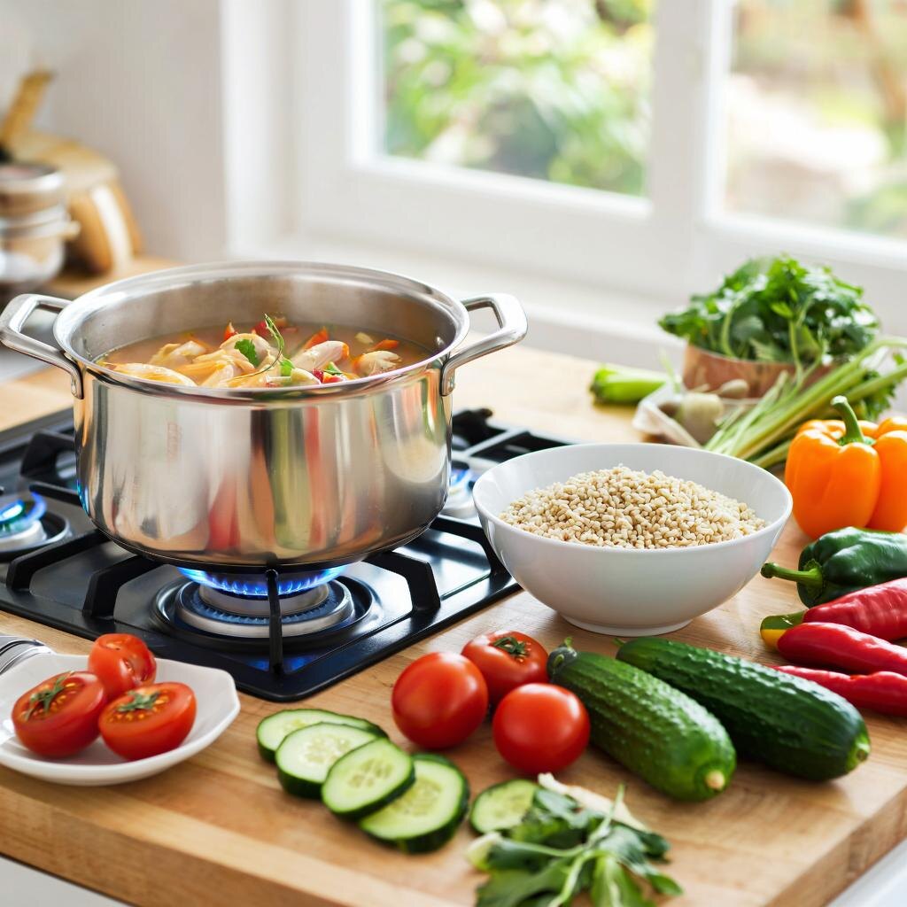 Рецепт супа с булгуром, курицей и овощами выглядит следующим образом: Ингредиенты: - Куриная грудка или филе бедра — 300 г - Булгур — 1 стакан (около 180–200 г сухого продукта) - Картофель — 2 средних клубня (~250 г) - Морковь — 1 крупная (~150 г) - Лук репчатый — 1 средняя головка (~70 г) - Чеснок — 2 зубчика - Перец болгарский — половина среднего плода (~100 г) - Зелень свежая (укроп, петрушка, зеленый лук) — небольшой пучок - Оливковое масло — 2 ст.л. - Вода или куриный бульон — около 1,5 л - Специи: соль, черный молотый перец, паприка сладкая, сушеный тимьян Пошаговая инструкция приготовления: 1. Подготовка ингредиентов: - Нарежьте картофель кубиками размером примерно 1х1 см. - Почистите морковь и натрите её крупной теркой либо порежьте мелкими кусочками. - Очистите луковицу и мелко покрошите. - Разрежьте болгарский перец пополам, удалите семена и плодоножку, порежьте соломкой или небольшими квадратиками. - Мелко измельчите чеснок. - Если используете свежие листья зелени, промо