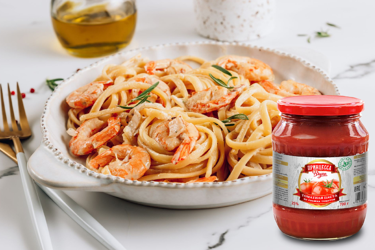 Блюдо "Паста с морепродуктами, зеленью и чесноком в томатном соусе" является популярным итальянским рецептом, который стал популярным по всему миру. Оно сочетает в себе свежие морепродукты, ароматные травы и богатый томатный соус для создания превосходного вкуса и текстуры. Белое сухое вино: 125 мл Тертый сыр пармезан: 200 г Лимон: ½ штуки Чеснок: 2 головки Помидоры: 2 шт Оливковое масло: 6 столовых ложек Томатная паста: 50 г Морская соль: щепотка Спагетти: 300 г Коктейль из морепродуктов: 750 г Свежемолотый черный перец: щепотка Лук: 1 штука Итальянская измельченная петрушка: 2 столовые ложки 1. Способ приготовления: опустите морепродукты в теплую воду и отставьте в сторону на 20 минут. Очистите и обмойте креветки, если вы готовите их отдельно от морского коктейля. 2. В средней кастрюле подогрейте 3 ст. л. оливкового масла, добавьте мелко нарезанный лук и чеснок и обжарьте до мягкости (около 4 минут). Заранее приготовьте нарезанные томаты и добавьте их к луково-чесночной смеси на огне