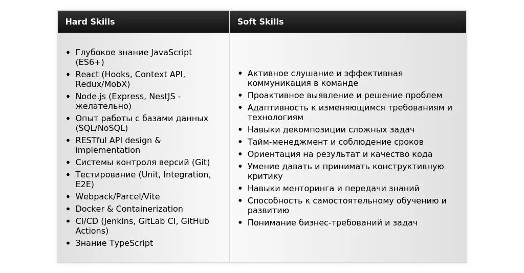 - В разделе "Навыки" перечислены все необходимые компетенции.