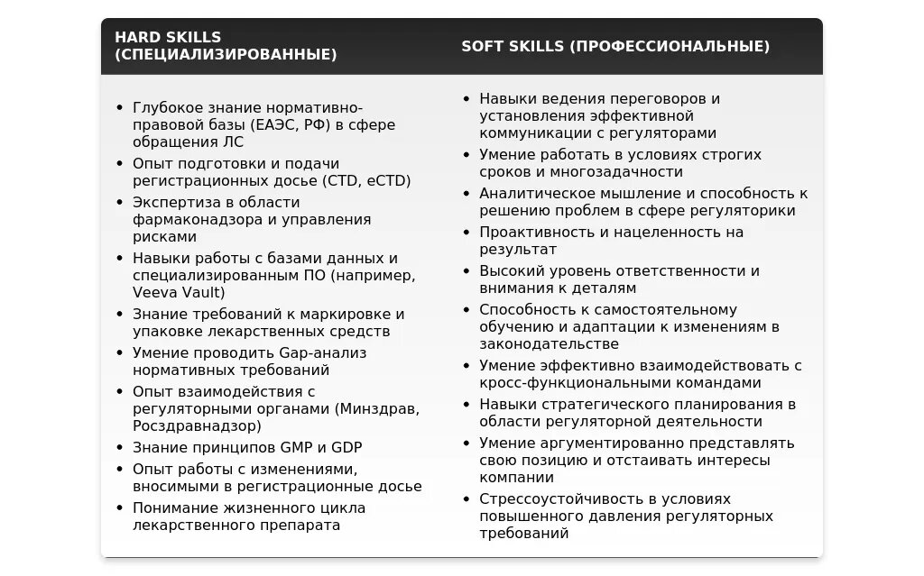 "Знание основ законодательства в сфере обращения лекарственных средств. Подготовка и оформление документов для регистрации лекарственных средств. Внимательность к деталям. Ответственность. Обучаемость."