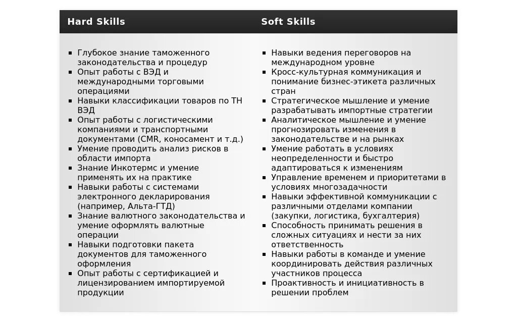 Логистика: *Оптимизация логистических процессов*, *управление цепочками поставок*, *складская логистика*. Закупки: *Поиск поставщиков*, *заключение контрактов*, *контроль качества продукции*. ВЭД: *Знание Incoterms*, *работа с таможенными органами*, *валютный контроль*.