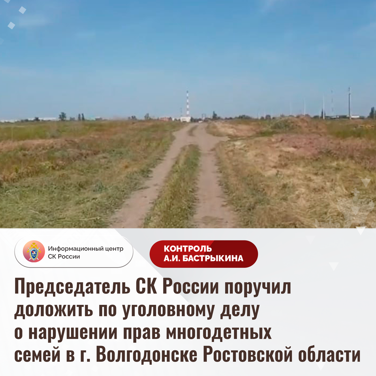 Председатель СК России поручил доложить по уголовному делу о нарушении прав многодетных семей в г. Волгодонске Ростовской области В комментариях в аккаунте приемной Председателя СК России А.И. Бастрыкина «ВКонтакте» размещено видеообращение жителей города Волгодонска Ростовской области о нарушении их прав. Около 10 лет назад льготной категории граждан были предоставлены земельные участки для индивидуального жилищного строительства без надлежащей транспортной инфраструктуры и коммуникаций. При этом многодетным семьям предложено за свой счет подключить жилые дома к системе электроснабжения, что для них финансово затруднительно. Многочисленные обращения в различные инстанции результатов не принесли. Ранее указанная ситуация освещалась в социальной сети. А.И. Бастрыкин ставил ее на контроль в центральном аппарате ведомства. В СУ СК России по Ростовской области по данному факту расследуется уголовное дело. Председатель Следственного комитета Российской Федерации Александр Иванович Бастрыки