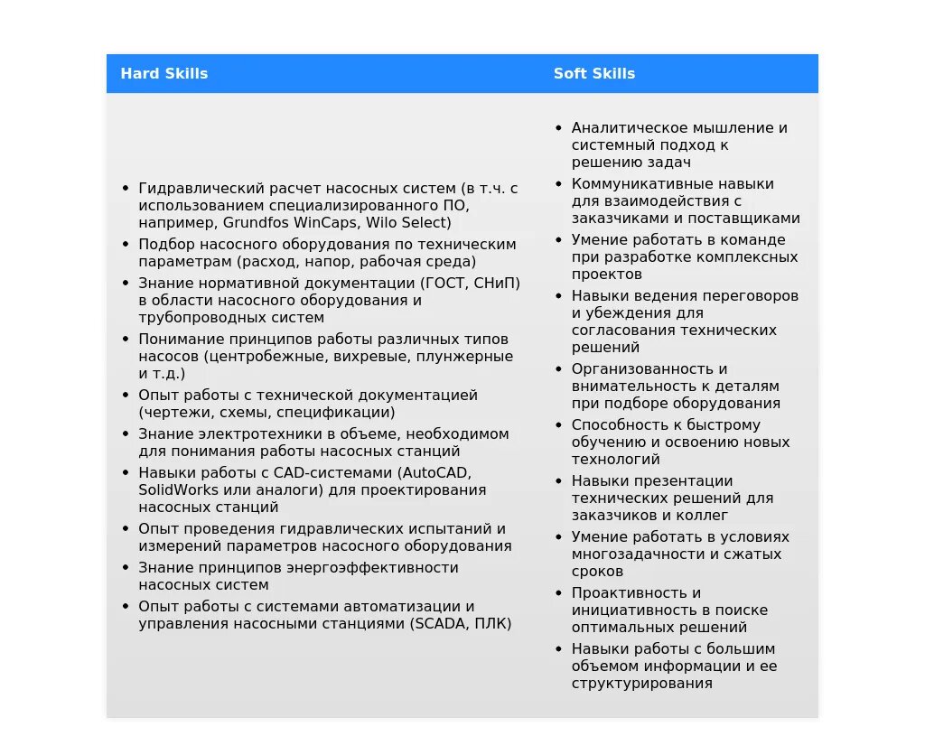 - Примеры ключевых слов: "подбор насосов", "гидравлические расчеты", "AutoCad", "SolidWorks", "API стандарты", "водоснабжение", "водоотведение", "нефтегазовая промышленность".