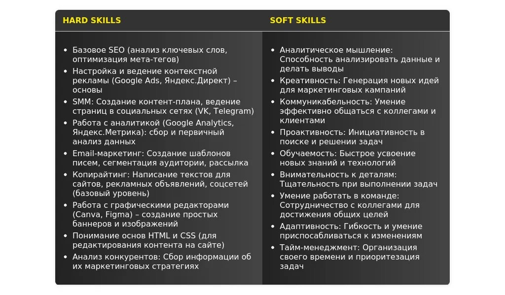 Раздел "Навыки" должен четко демонстрировать, что вы обладаете компетенциями, необходимыми для успешного выполнения задач на позиции стажера.