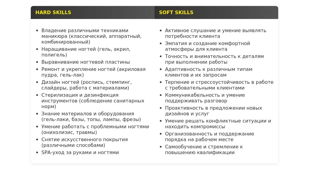 - Разделите навыки на категории (например, "Техники маникюра", "Техники наращивания", "Навыки дизайна").