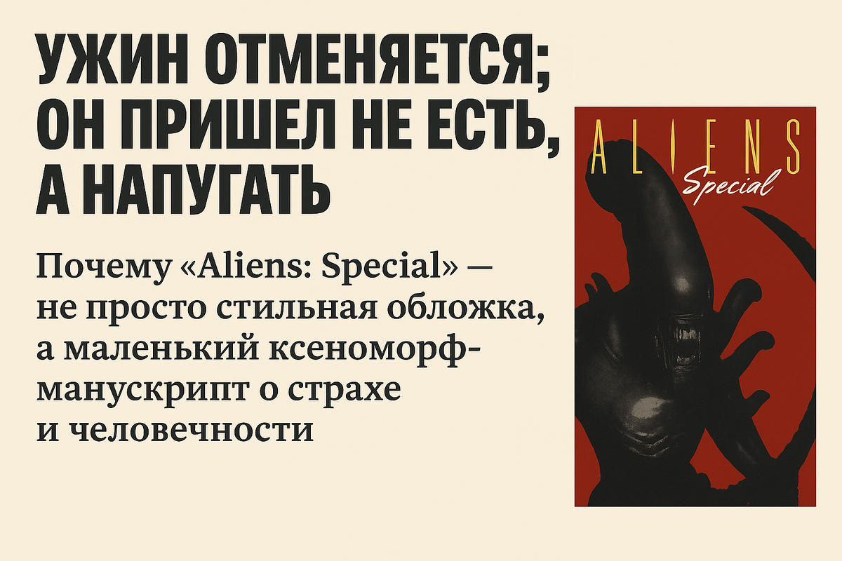 Почему “Aliens: Special” — не просто стильная обложка, а маленький ксеноморф-манускрипт о страхе и человечности "Когда чужой надевает смокинг, не спешите расслабляться — это не комедия, это бал, где угощением будете вы." Комикс Aliens: Special, выпущенный в 1992 году издательством Dark Horse Comics, — это сборник из двух коротких, но крайне атмосферных историй, каждая из которых по-своему расширяет вселенную “Чужих”. Это как бонус-трек к альбому, который вдруг оказывается самым мощным. Первая история рассказывает о выживании в глубоком космосе, когда всё, что остаётся — это страх и пустота. Вторая — парадоксально более человечная, хотя и с таким же количеством челюстей и щупалец. Сюжеты не связаны напрямую, но объединены общей темой: что делает нас людьми, когда рядом — нечто совсем нечеловеческое? “Это не просто хоррор. Это способ вспомнить, что даже в пустоте космоса у страха остаётся лицо... только не человеческое.” Я нашла этот выпуск случайно — и он оказался именно тем, что разжиг