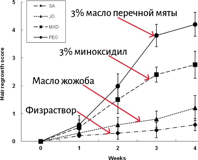 ДОМАШНИЕ МАСКИ и эфирные масла работают! Лук, чеснок, розмарин, кофеин, пальма Сереноа, алоэ, масло тыквы и многое другое. ВСЕ РАБОТАЕТ для стимуляции роста волос при андрогенетической (АГА), диффузной и очаговой алопеции. Все найдено в авторитетных медицинских зарубежных базах! Многое идет в сравнении с Миноксидилом и часто не только также, но и лучше по действию! Есть альтернатива Миноксидилу и Финастериду (у них, увы, есть побочки и сильный эффект отмены, синхронизация). Вот кратко очень понятный рисунок одного из исследований: эфирное масло МЯТЫ перечной возобновляет рост волос и намного лучше Миноксидила! И этих исследований много в приложении.Если по-научному, цитата "3% эфирное масло перечной МЯТЫ, разведенное в масле ЖОЖОБА, стимулирует и вызывает быструю стадию роста волос (анаген), сохраняя васкуляризацию волосяных сосочков и может использоваться в качестве