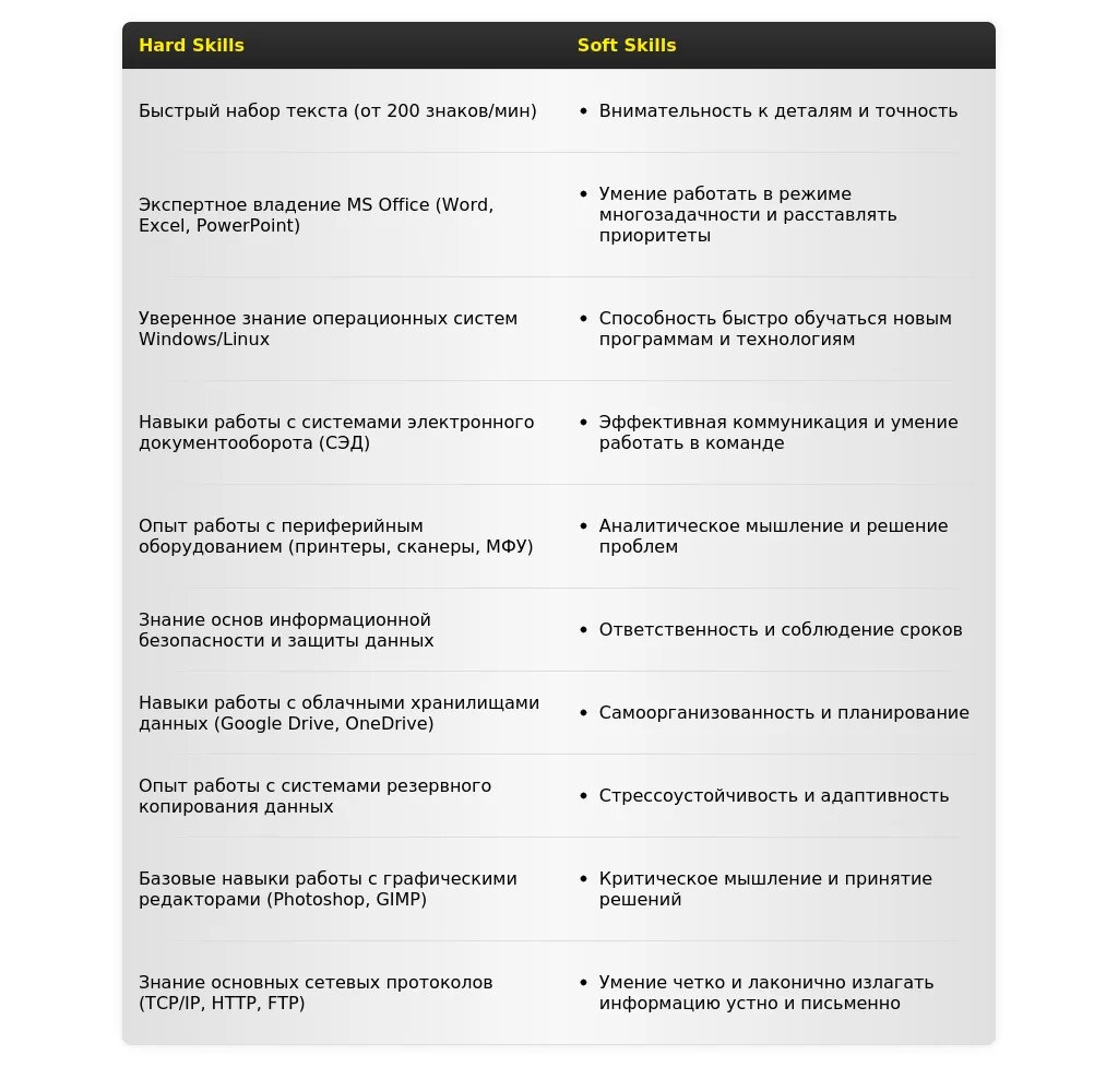 - Акцент на качествах и навыках: Внимательность, усидчивость, скорость печати, знание программного обеспечения.