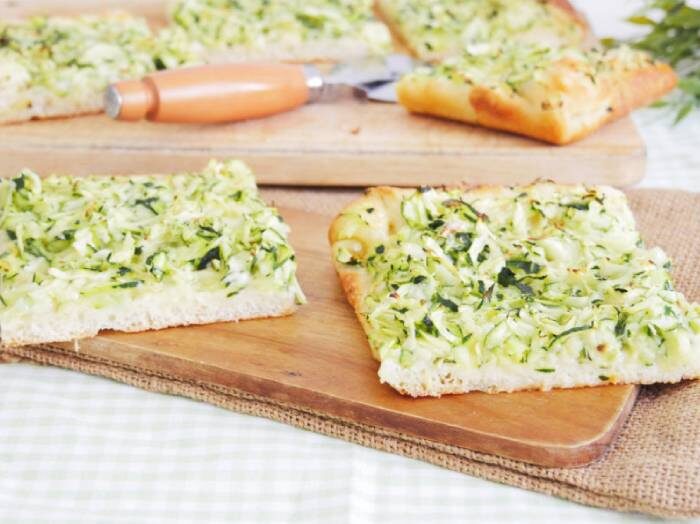 Эта пицца сделана с цуккини. Особенность рецепта в том, что сыр спрятан под слоем из сырых натертых цуккини. Получается такой своеобразный открытый пирог с кабачками.