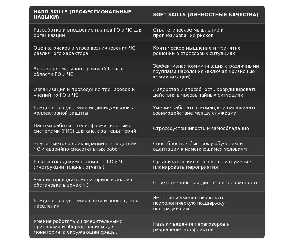 - Для вакансий в государственных учреждениях: "Разработка и внедрение планов ГО и ЧС в соответствии с законодательством РФ", "Организация и проведение учений и тренировок по гражданской обороне", "Участие в ликвидации последствий ЧС".