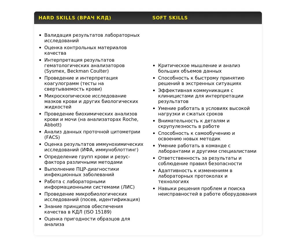 Навыки: Выполнение полного спектра клинико-лабораторных исследований, работа с гематологическими и биохимическими анализаторами, знание нормативной базы, клиентоориентированность, навыки работы с компьютером (MS Office, специализированное ПО).