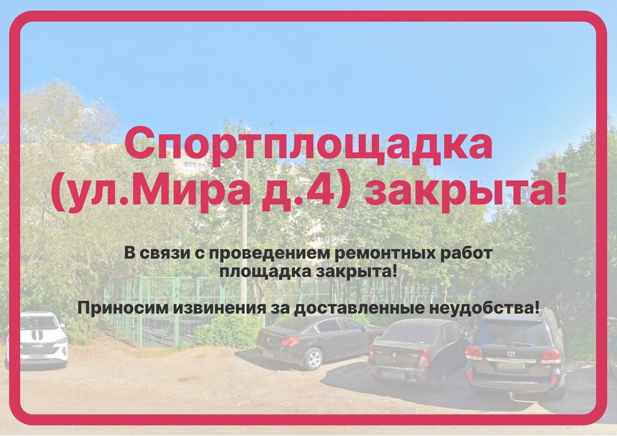 🔊 Завтра, 5 июня, спортивная площадка (ул.Мира д.4) будет закрыта на ремонт