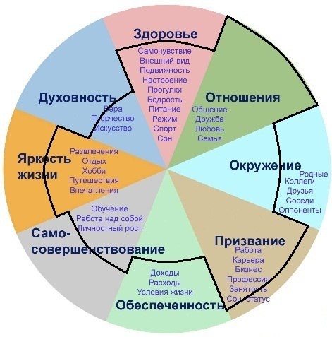 то самое колесо сфер жизни, на котором вы можете оценить свою жизнь от 0 до 10, узнав свою примерную самооценку на деле, по принципу кто вы есть по жизни - "тварь дрожащяя", "надо поднажать" или все "чику-пуки". Я бы еще добавил посередине в центре "СМЫСЛ", но мы отставим такие "тяги" для прямого эфира