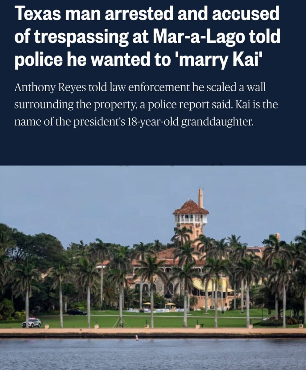 Мужчина проник в поместье Трампа с намерением жениться на его внучке. 23-летний Энтони Рейес был задержан Секретной службой после проникновения на территорию флоридского поместья Мар-а-Лаго, где проживает президент США Дональд Трамп с семьёй. Он перелез через стену, чтобы проповедовать Евангелие и жениться на Кай, — сообщили правоохранители, имея в виду 18-летнюю внучку Трампа. На момент инцидента ни президент, ни члены его семьи не находились в поместье. Рейесу назначили залог в $50 тыс. и запретили контактировать с Трампом или его родственниками. Кай Трамп, старшая дочь Дональда Трампа-младшего, недавно отметила совершеннолетие. Её назвали в честь прадеда — датского джазового музыканта Кая Эванса.