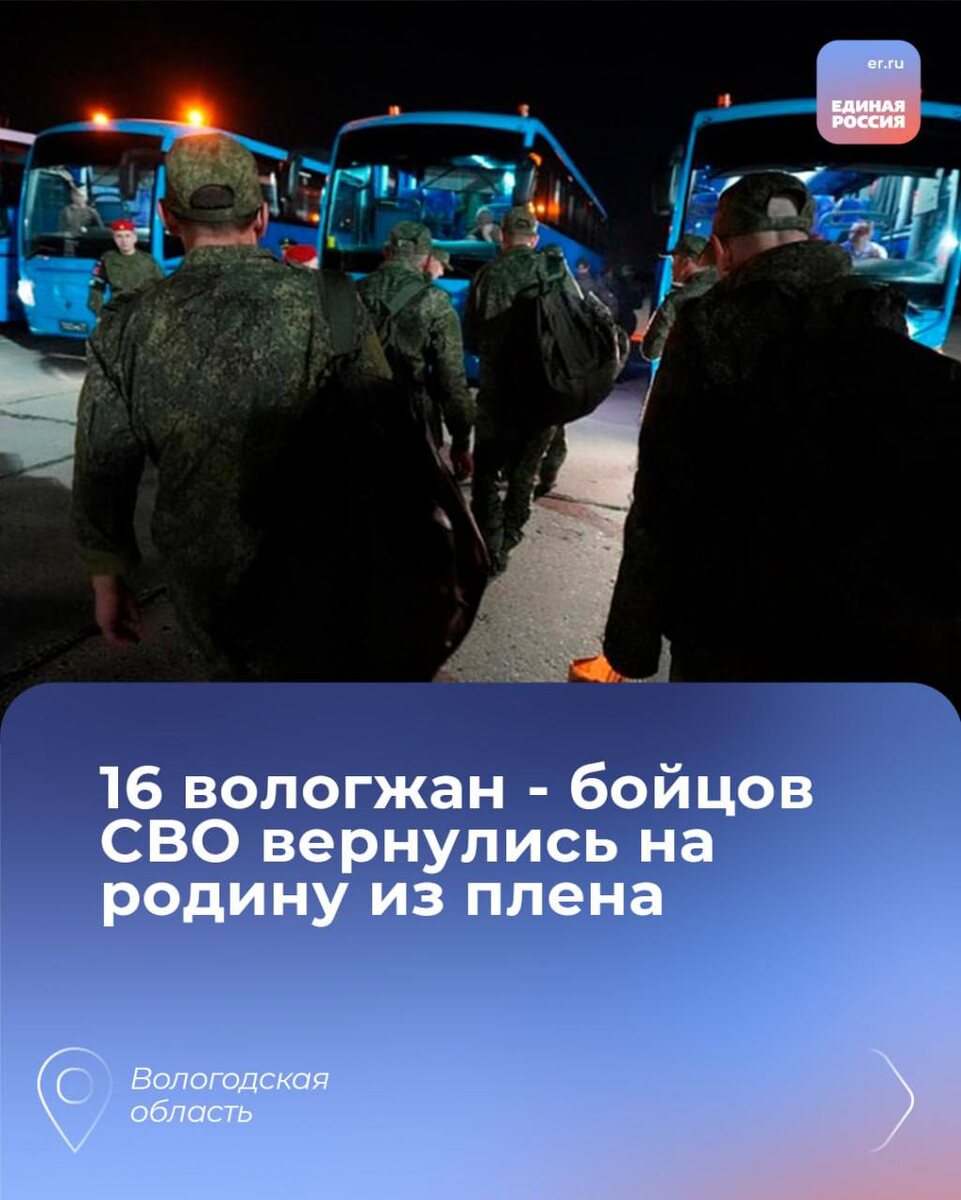 16 вологжан вернулись домой из плена В результате крупнейшего обмена военнопленными между Россией и Украиной на родину возвращены 16 наших земляков — участников специальной военной операции. Эти бойцы оказались в плену, защищая страну, и теперь, наконец, вновь на свободе. Сейчас вологодские ребята находятся на территории Республики Беларусь. В ближайшее время они пройдут все необходимые процедуры и отправятся домой. Им предстоит курс реабилитации и адаптации к мирной жизни. #ЕР35 #своихнебросаем #времяпомогать #мывместе